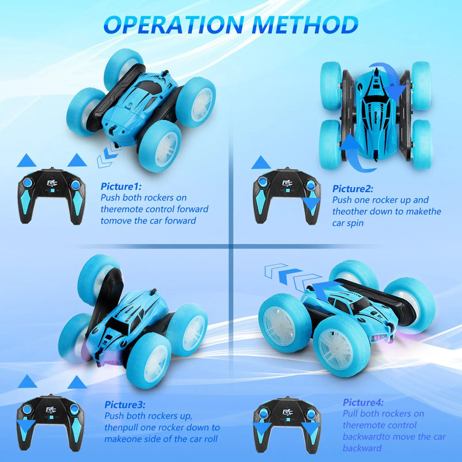 2.4G Double Sided RC Stunt Car 360 Degree Rotating Remote Control Car with Light 2 Rechargeable Batteries Blue